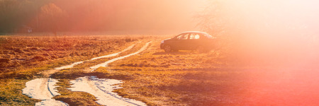car in a meadow near the forest and snowy road in the early morning. Web banner.