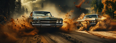 Epic race of vintage cars on a forest road. AI generation