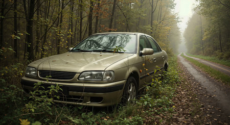 a small grey car is parked near a grassy area, enveloped in a mysterious fog. this captivating photo, reminiscent of jessica rossier's lively coastal landscapes and vintage aesthetics, evokes a sense of intrigue. the high horizon lines, inspired by lois van baarle's work, add depth to the scene. the supernatural atmosphere, akin to alasdair mclellan's style, creates an enchanting ambiance. ai generated