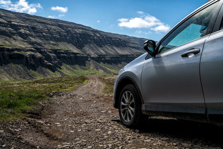4WD SUV vehicle car running on gravel road with nature mountain landscape in Iceland. Adventure and extreme sport.