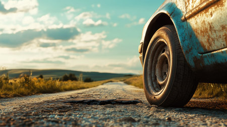 Flat tire on a car with a cracked rim, sitting on a gravel road in the countryside