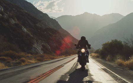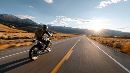 A thrilling motorcycle ride along an open highway captures the essence of adventure, showcasing stunning mountains and a breathtaking sunset backdrop.