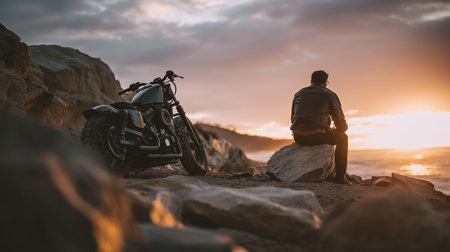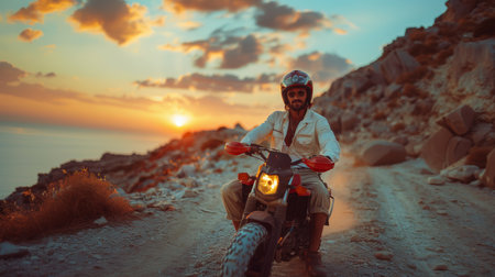 An adventurous man wearing a helmet and goggles rides bike along a rugged coastal trail. The sunset casts a warm glow, enhancing the scenic beauty of the landscape.