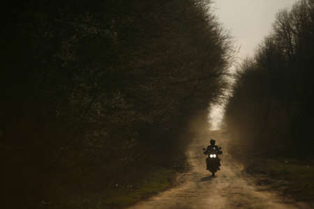A motorcycle and its rider are silhouetted on an off-road track in Romania