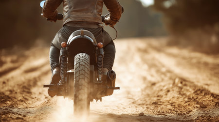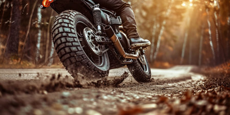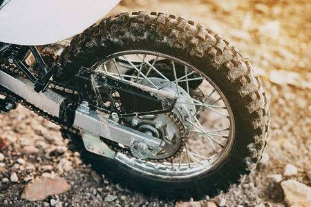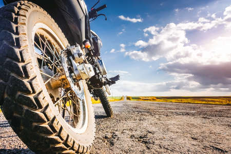 Studded cross motorcycle wheel on the ground level. Focus on the rear wheel. Details of a motorbike closeup. Traveling concept. Driving the empty road on a tour journey. Discover the beauty of earth.