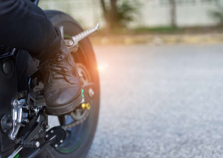 Closeup Shoe boot touching brake woman biker with glove safety ride acceleration speed control on motorcycle vehicle and nature background.
