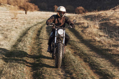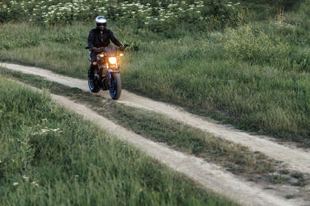 man in a black uniform on bike against the backdrop of panorama of field and blue sky. motorcycle travel concept