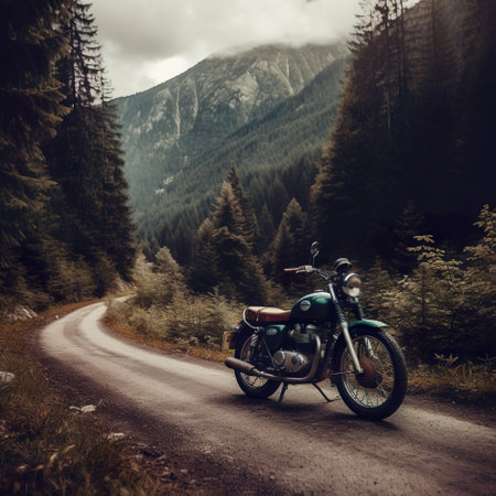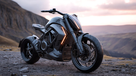 Sleek Motorcycle on Mountain Road at Dusk: High-Performance Futuristic Design