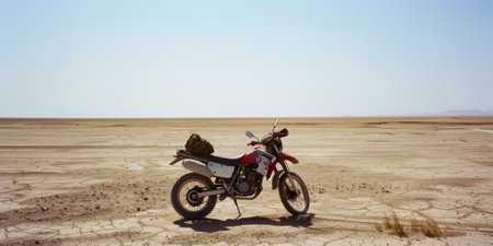 A motorcycle is parked in the vast expanse of the desert landscape.