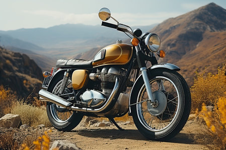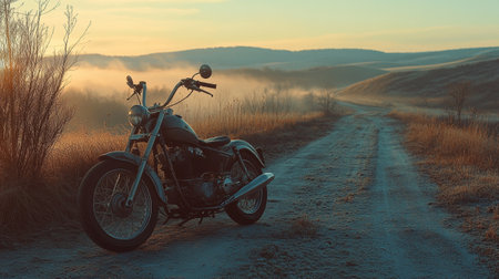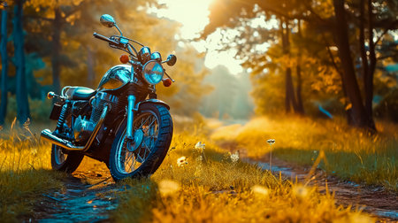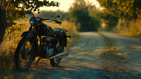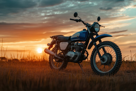 A vintage motorcycle is presented outdoors, showcasing its design and details. Warm colors dominate the scene, with a setting sun providing a golden glow. The composition highlights the motorcycle against a backdrop of natural elements. This image is suitable for commercial applications related to transportation and lifestyle.