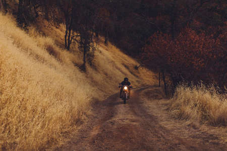Motorcyclist riding on the road in the mountains at sunset.