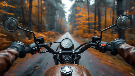 Close-up of a motorcycle in the autumn forest. A man rides a motorcycle on the road.