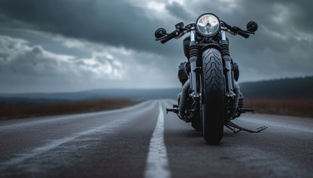 Black motorcycle standing on a desolate highway, the road extending into thick fog. Concept of freedom and solitude