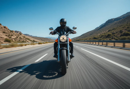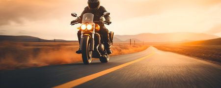 Lone motorcycle driver cruising on smooth asphalt highway blurred backgroundcopy space solid background --ar --v - relaxed stealth. Concept Adventure Motorcycling, Smooth Asphalt