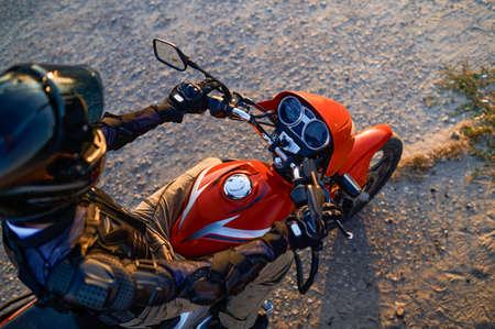 Horizontal view. Portrait of a motorcyclist equipped with helmet and protective clothing, drives a motorcycle.