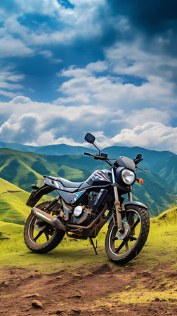 Motorcycle is parked on peak of mountain, showcasing the rugged terrain and adventurous spirit. Motorcycle trip