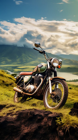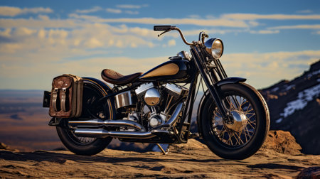 An AI generated illustration of a motorcycle that is sitting on a rocky hill side with a nice blue sky
