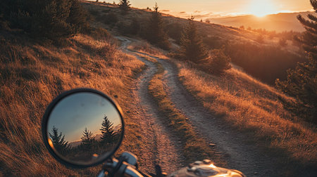 A road mirror reflecting a motorbike riding up a winding trail with golden hour lighting