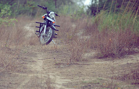 Motorcycle on a dirt road in the morning fog. Retro style.