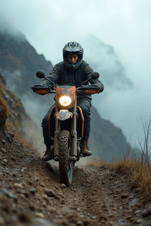 Motocross rider on the road in the foggy mountains.