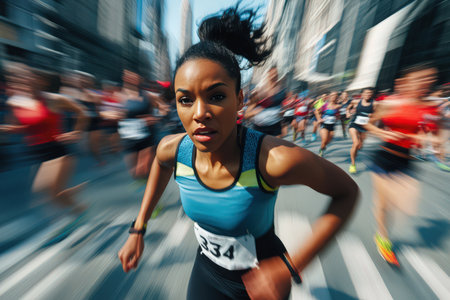 American woman running in a city marathon, bold athletic outfit, focused expression, dynamic motion blur highlighting energy and urban atmosphere.