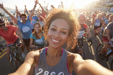 Runners are joyfully participating in a marathon, showcasing determination and teamwork in a bustling city environment, surrounded by cheering spectators and vibrant attire. Generated AI. This is a fictional character not a real person