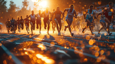Runners poised at the starting line of a stadium, showcasing determination and focus as they prepare to launch into an exhilarating track race filled with anticipation and energy
