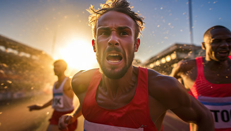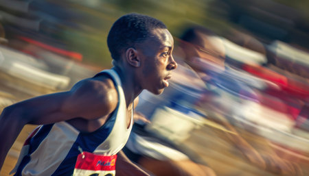 Black runners of various races entering the final stages The face shows concentration and effort, with sweat on the skin.