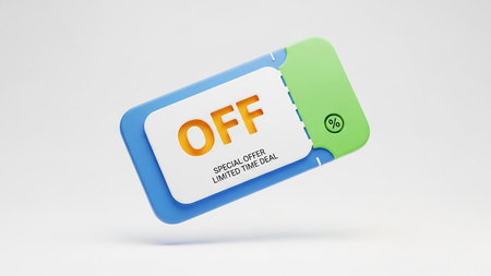 A 3D rendered discount coupon with blue and green accents, featuring the word OFF in orange and a percentage symbol.