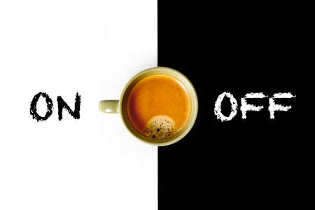 cup of coffee on a black and white background, On Off sign, copy space