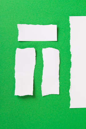 Torn pieces of white blank paper laid out randomly on a blue cardboard background. Top view