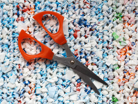 scissors are on pieces of finely chopped colored paper. children's creativity start of application