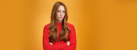 Suspicious intense and defensive ginger girl standing in passive-aggressive pose pouting and frowning looking with disbelief and disdain at camera, offended against orange background