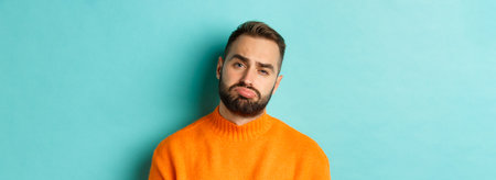 Close-up of upset young man sulking, looking disappointed and distressed, standing in orange sweater against turquoise background