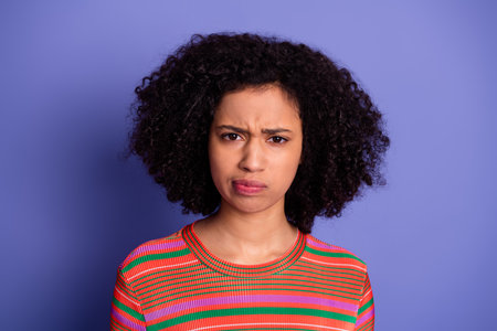a close photo of a sad, upset young woman frowning and lowering the corners of her lips down, looking at the camera with a stern look