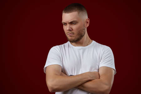 handsome man in a white t-shirt thinks about something
