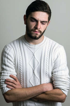 Studio shot of displeased sad man.