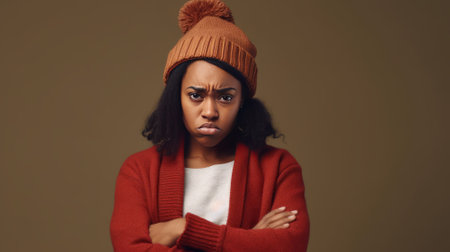 Portrait of young african american woman wearing winter hat and sweater on brown background