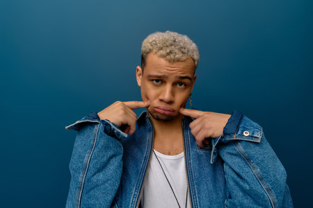 Young man playfully models a stylish denim jacket against a blue background.