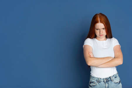 Sad, disappointed. Caucasian young girls portrait on blue background. Beautiful female redhair model with cute freckles. Concept of human emotions, facial expression, sales, ad, youth culture.