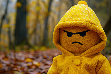An evocative image suitable for children's book illustrations, seasonal event promotions, or creative storytelling blogs | This photograph showcases a vivid, life-size representation of an animated character dressed in a textured yellow raincoat, set against a blurred backdrop of an autumn forest. The character, with an embroidered expression of displeasure, stands out amidst the earthy tones of fallen leaves and the muted grays of the rain-streaked environment, encapsulating the essence of a rainy day. The raincoat's bright yellow hue and the water droplets speckling its surface draw the eye, conveying the dampness and chill of the autumn weather, while the character's furrowed brow and downturned line for a mouth visually narrate a story of discontentment, possibly with the rainy weather or a thwarted adventure. The narrow depth of field keeps our focus locked on the central figure, highlighting the textures of the fabric and the raindrops that cling to it, and imbuing the character with a sense of depth and realism. The image's rich detail and emotional resonance could ignite a child's imagination or serve as a metaphor in discussions about coping with disappointment or making the best of a gloomy situation | Excellently suited for educational material discussing weather and seasons, engaging visual content for storytelling or creative writing prompts, or artistic expression in home or educational environments. It also stands as a striking piece for editorial use in magazines targeting emotional intelligence development in children or for events centered around children's entertainment and engagement | a portrait of an animated character dressed in a raincoat, imbued with personality and emotion against a rain-swept backdrop, rich in seasonal colors and textures, leaving space for textual content or further artistic embellishment