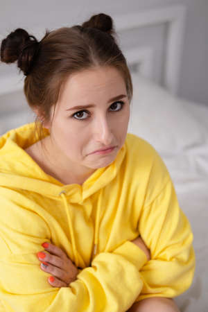 Portrait of young attractive caucasian woman suffering from depression, stress and anxiety. Sad and lonely woman crying, feeling depressed, distressed, worried and overwhelmed. Mental Health care.