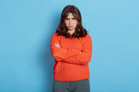 Upset young girl standing isolated over blue background with folded hands, looking at camera with pout lips, being very sad, expressing negative emotions, wearing orange sweater and leggins.