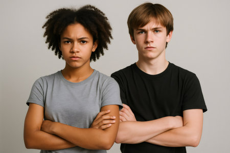 Two upset teenagers with crossed arms showing disapproval and disappointment standing on gray background