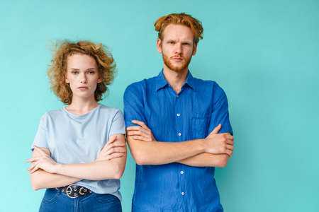 Portrait of a beautiful serious youngcouple standing isolated over blue background
