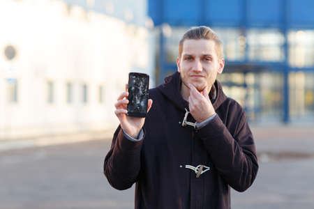 Desperate and astonished man holds cracked smartphone . Screen broken smartphone. Cracked phone Broken phone. Sad guy holding a broken expensive smartphone