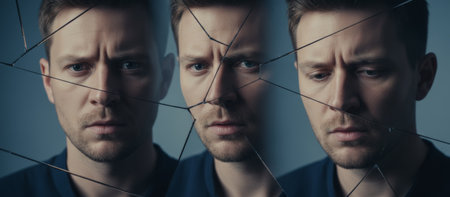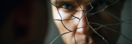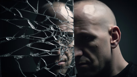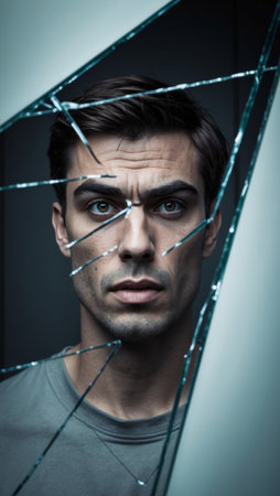 Glass crack. Emotions control. Man behind crushed glass. Crush test.