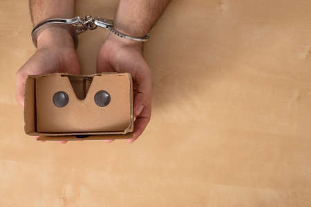 Digital crime concept. Hands in shackles grabbing some virtual reality glasses.