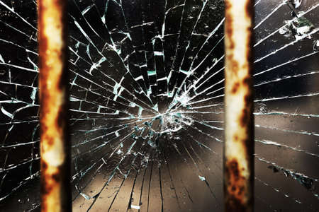Detail of shattered glass, burglar on background. Concept of violence, burglary, broken window and insurance.