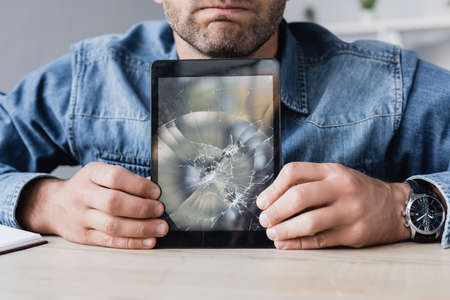 Cropped view of businessman holding smashed digital tablet on wooden table